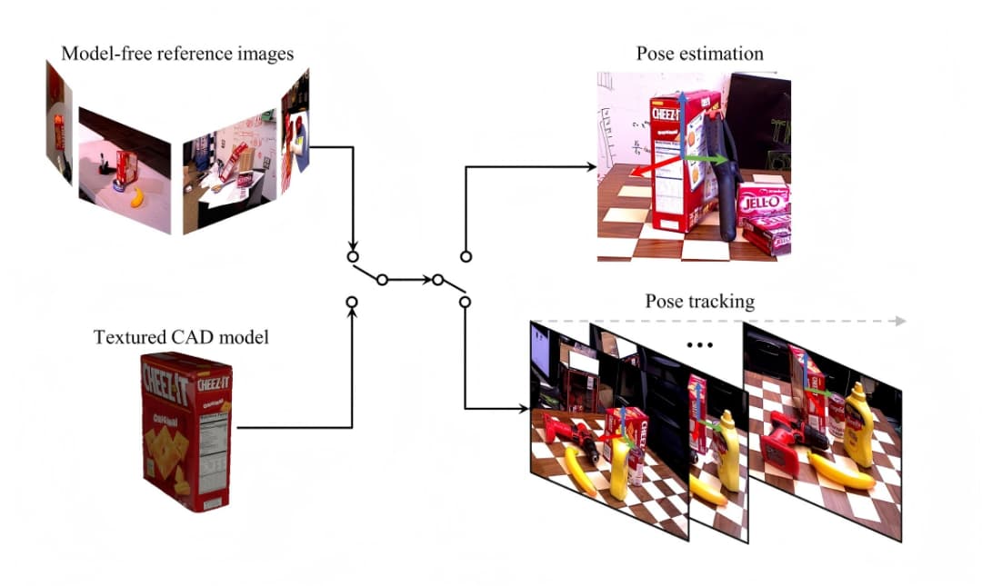 “We present FoundationPose, a unified foundation model for 6D object pose estimation and tracking, supporting both model-based and model-free setups. Our approach can be instantly applied at test-time to a novel object without fine-tuning, as long as its CAD model is given, or a small number of reference images are captured. ” — FoundationPose: Unified 6D Pose Estimation and Tracking of Novel Objects