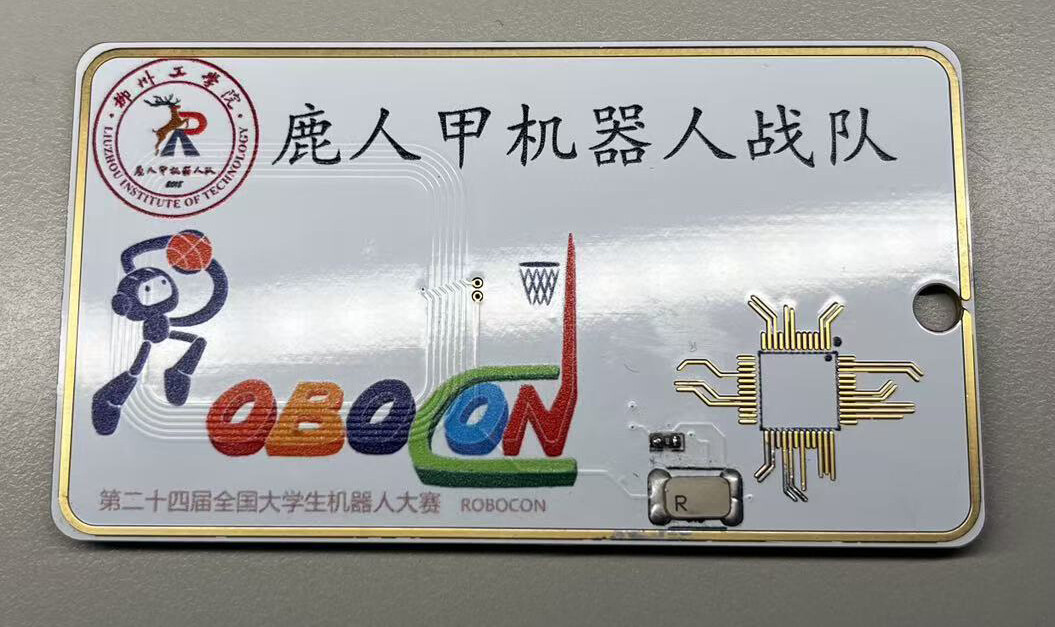 柳州工学院鹿人甲战队的 PCBNFC 卡有着科技战队都拥有的 “科技战队范儿” ,它用了 PCB(材质,表面能看到电路纹路和小型电子元件,自带 NFC 功能,实用又有技术感相互融合的设计,正面上方有战队的队徽与队名名,中间印着 “鹿人甲机器人战队” 的名称,四周鎏金的线条包裹着全卡,为这张小小的NFC卡提升了些许的精致感,正面搭配卡通机器人投篮 + 篮球框的图案,这是第二十四届全国大学生机器人大赛的比赛主题,还搭配着 “第二十四届全国大学生机器人大赛 ROBOCON” 的标志,把战队身份、赛事属性都清晰体现出来了。
