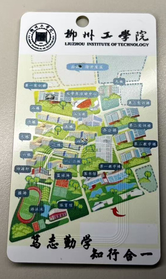 背面上方由校徽与校名组成,整体为柳州工学院校区地图,突出了学校教学位置与生活区,为拥有者提供了具体的学校设施位置,正下方是柳州工学院的校训:“笃志勤学,知行合一”。写出了学校的教书育人的总体方向。
