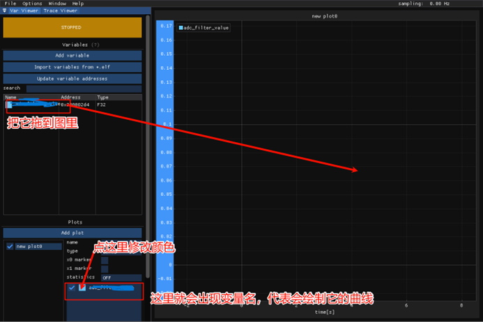 点Import variables from *elf,输入变量名搜索想要看的变量,仅支持全局变量,如果没有想要查看的变量需要在代码里加: