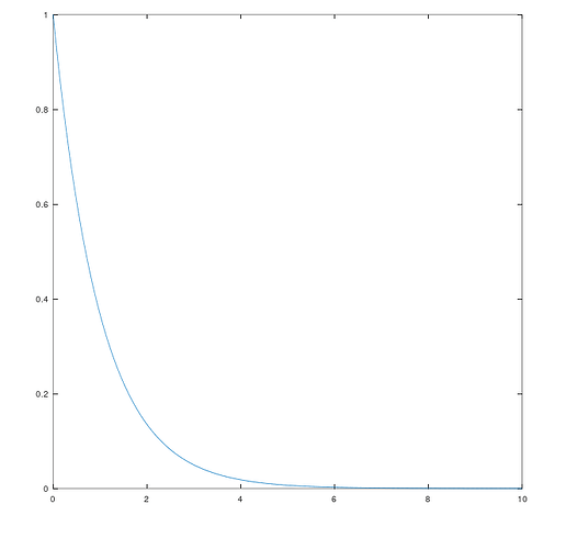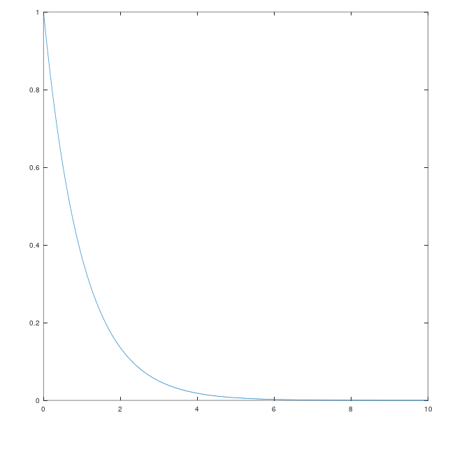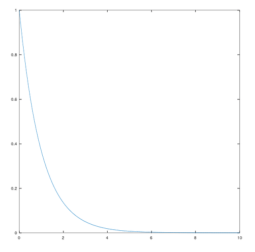 这时我们就解出了eobse_{obs},即随时间变化估价值x^\hat{x}与真实值之间的关系x^\hat{x}。我们发现eobse_{obs}与时间的关系是一个指数关系,这就意味着,如果A−KC<0A -KC < 0,eobse_{obs}与时间的关系如下图。