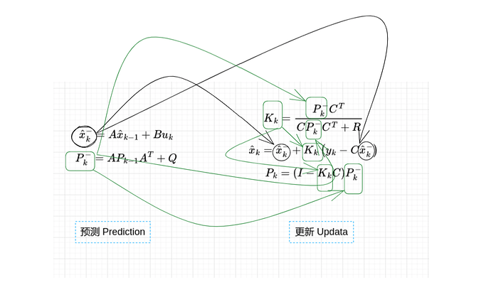 - 更新部分 Kk=Pk−CTCPk−CT+Rx^k=x^k−+Kk(yk−Cx^k−)Pk=(I−KkC)Pk−K_{k}=\frac{P_{k}^{-} C^{T}}{C P_{k}^{-} C^{T}+R}\\ \hat{x}_{k}=\hat{x}_{k}^{-}+K_{k}\left(y_{k}-C \hat{x}_{k}^{-}\right)\\ P_{k}=\left(I-K_{k} C\right) P_{k}^{-}