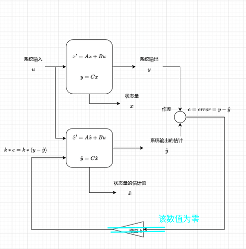 首先,如果想验证x^\hat{x} 趋近于x,我们就可以验证eobs=x−x^e_{obs} = x - \hat{x}趋近于零,这样我们可以通过验证eobs=x−x^e_{obs} = x - \hat{x}趋近于零来进而验证x^\hat{x}趋近于xx。这时我们拿出真实系统的方程与我们自己构建的系统方程