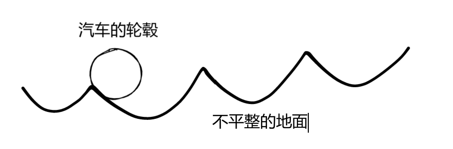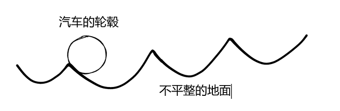 一目了然选手C赢了。他相较与选手A与选手C方差实现了位置在均值处并且方差极小。作为一名未来的工程师,我们也想像选手C一样获得比赛的胜利,那么为什么选手C更胜一筹呢,如果仅使用GPS,IMU或里程计不对数据进行滤波操作,数据可能会随时间积累变得越来越虚假。简单来讲,就拿汽车自带的里程计为例,假如里程计通过计算汽车轮毂转动的圈数来计算汽车的相对运动距离,但是我们的路面不够平稳,它是如下图这个状态。