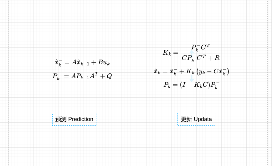- 预测部分 x^k−=Ax^k−1+BukPk−=APk−1AT+Q\hat{x}_{k}^{-}=A \hat{x}_{k-1}+B u_{k} \\ P_{k}^{-}=A P_{k-1} A^{T}+Q
