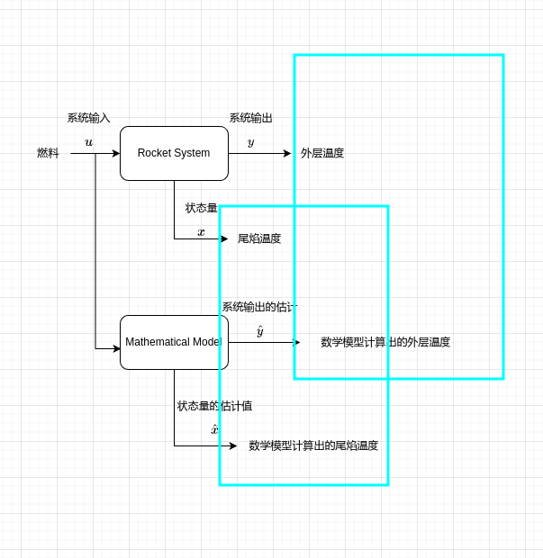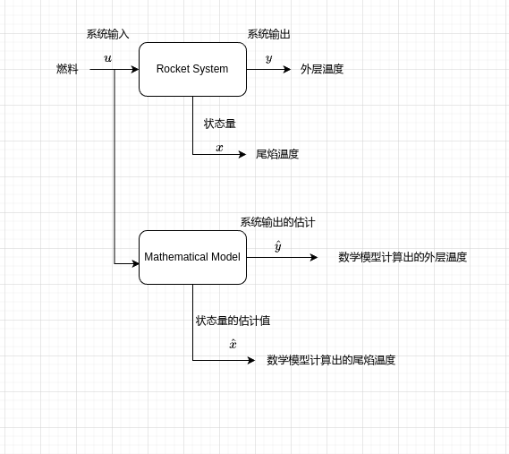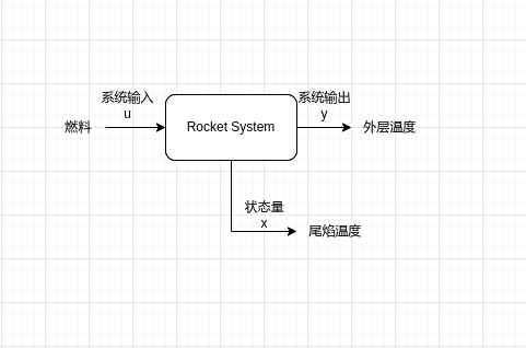 我们分析这个系统我们发现,火箭尾焰的温度,是受燃料控制,燃料作为尾焰这个系统输出的输入,而我们要估计的量尾焰温度被称为这个系统的状态量,如下图所示。
