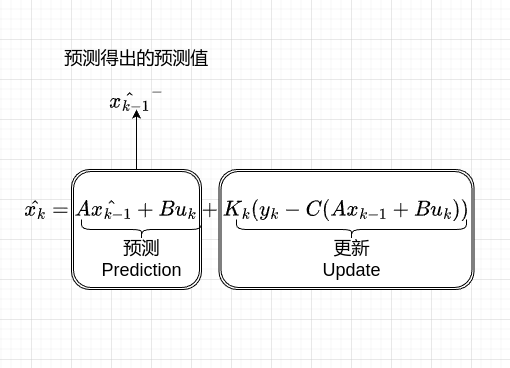 xk^=Axk−1^+Buk+Kk(yk−C(Axk−1+Buk))\hat{x_k} = A\hat{x_{k -1}} + Bu_k + K_k(y_k - C(Ax_{k-1} + Bu_k))