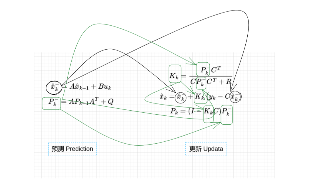 前一部Axk−1^+BuKA\hat{x_{k-1}} + Bu_K得出预测值xk−1^−{\hat{x_{k-1}}}^-将预测值代入更新Kk(yk−C(Axk−1+BuK))K_k(y_k -C(Ax_{k-1} + Bu_K)),对得出的数据进行修正。卡尔曼增益自动调整,最终实现最优估计。
