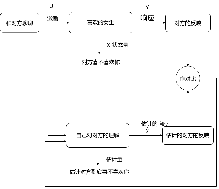那光苦恼可不行,那这个问题该怎么解决呢?这时我们想到了我们突然间想到了状态观测器。“有办法了”,为确定对方是否喜欢你,这个估计值,你要通过对对方施加一些激励,或者说是与对方说几句话,通过观察对方的反映或者响应来判断对方的想法将反映与自己的预期进行对比,得出结论对方到底喜不喜欢你。