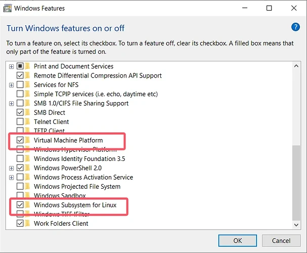 选择 适用于Linux的Windows子系统/Windows Subsystem for Linux 和 虚拟机平台/Virtual Machine Platform 功能: