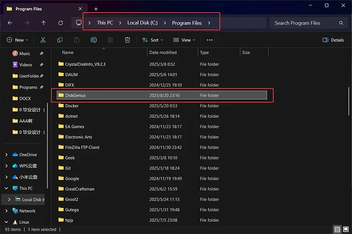 找一个纯英文目录创建一个DiskGenius文件夹,建议在任意一个磁盘分区里的Program Files文件夹下新建DiskGenius文件夹。