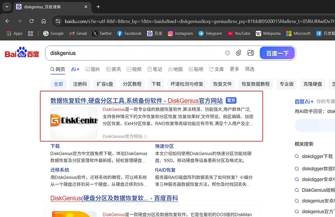 在Windows系统上打开百度搜索DiskGenius并下载。