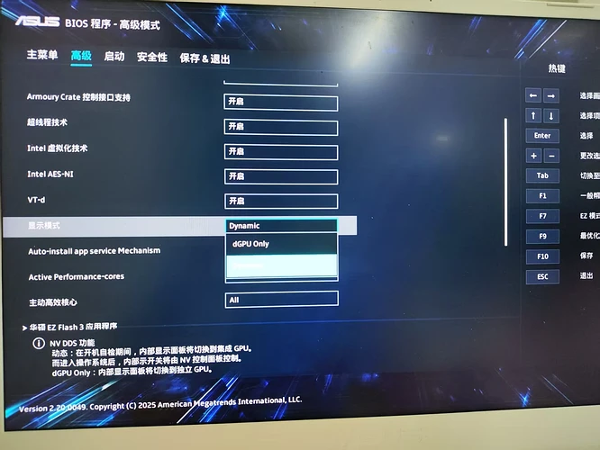③如果你发现,你的GPU0是NVIDIA开头的,而且没有GPU1,那么说明你关闭了核显,请按照下面的操作来关闭独显直连开启核显。(如果你是AMD独显,无所谓,开不开独显直连都一样,就不用管了,但是大部分人都不可能是AMD的独显,所以基本排除这一项了)