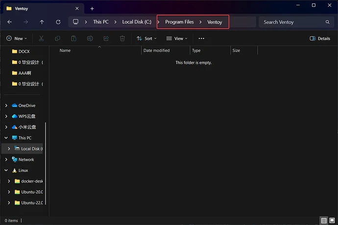 找一个纯英文目录创建一个Ventoy文件夹,建议在任意一个磁盘分区里的Program Files文件夹下新建Ventoy文件夹。