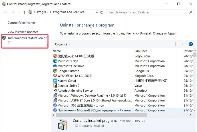 点击OK进入 程序和功能/Programs and Features 界面,点击 启用或关闭Windows功能/Turn Windows features on or off :