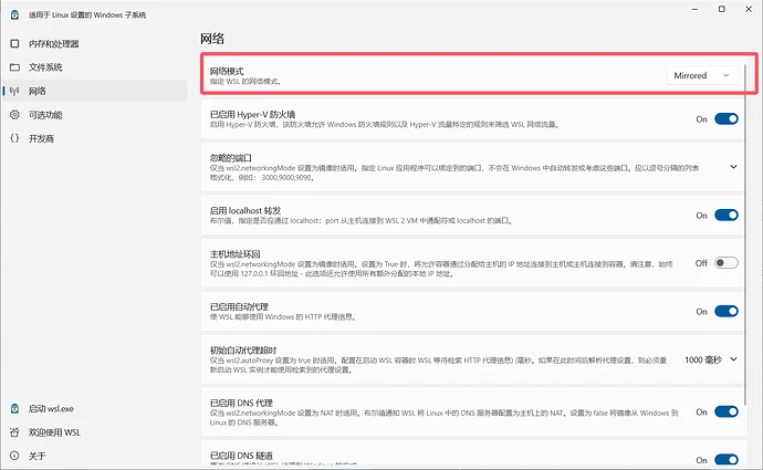 WSL2还提供了好几种模式,有一个模式叫Mirrored模式 (Windows 10 22H2及以上才能开启) ,相当于Docker的--network host,这种方式是让WSL2和Windows使用相同的IP,这样的话,不论是WSL2还是Windows都可以访问同网段的局域网设备了。
