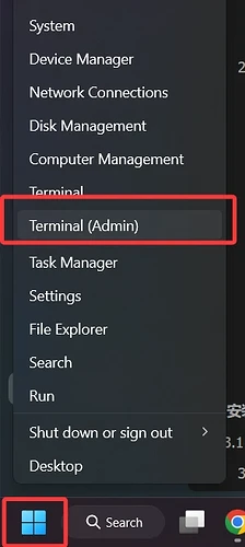 右键开始菜单,选择终端(以管理员身份运行)