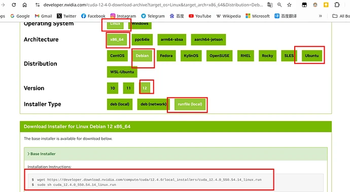 我是Debian12,所以选择了Debian12 ,(你是Ubuntu要选择Ubuntu)如下图所示,建议选择runfile文件进行安装。
